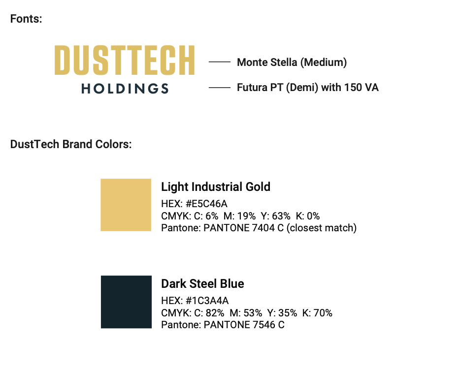 Created the official logo for DustTech Holdings and delivered a starter logo pack with a mini brand guide outlining colors, fonts, and usage. Built a bold, professional identity to represent their engineering expertise and air technology focus.
